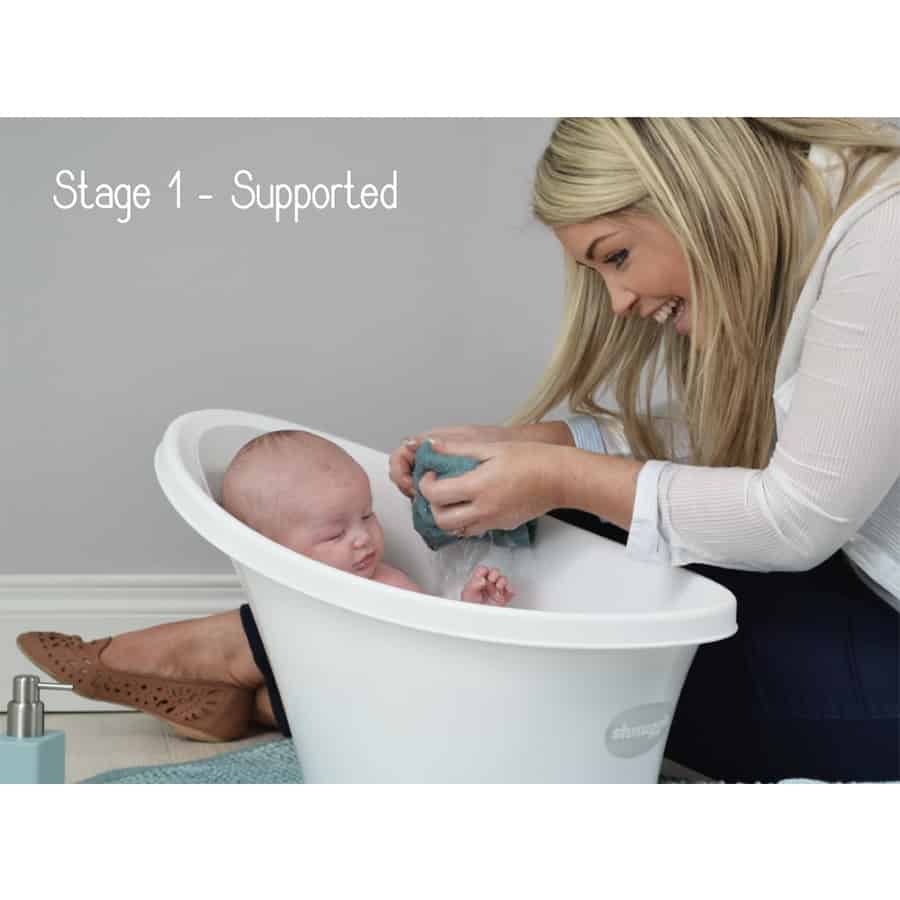 Benefits- Stage 1 – Supported: (Newborn) Baby feels safe and secure, amd after a few months you can have both hands free to wash and play with your baby. This makes bath time an enjoyable bonding experience.d
