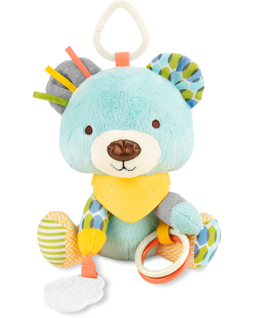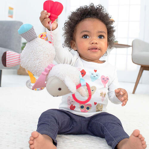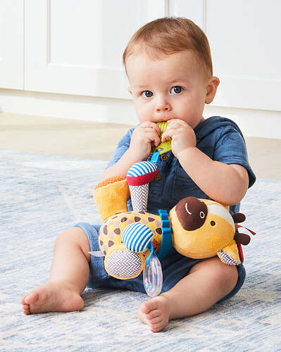 A soft toy and teether toy filled with textures, patterns and sounds! Little hands stay active as baby explores rattles, crinkles and more. This colorful character’s soft bandana teether toy detaches for mom to wear around her wrist for quick access. Perfect for multi-sensory play, this cute companion is ideal for fun at home or-on-the-go.