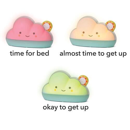 - Sleep Trainer Mode: Cloud lights up with easy-to-follow color cues: Red = Time For Bed; Yellow = Almost Time To Get Up; Green = Okay To Get Up