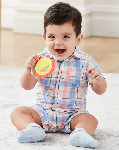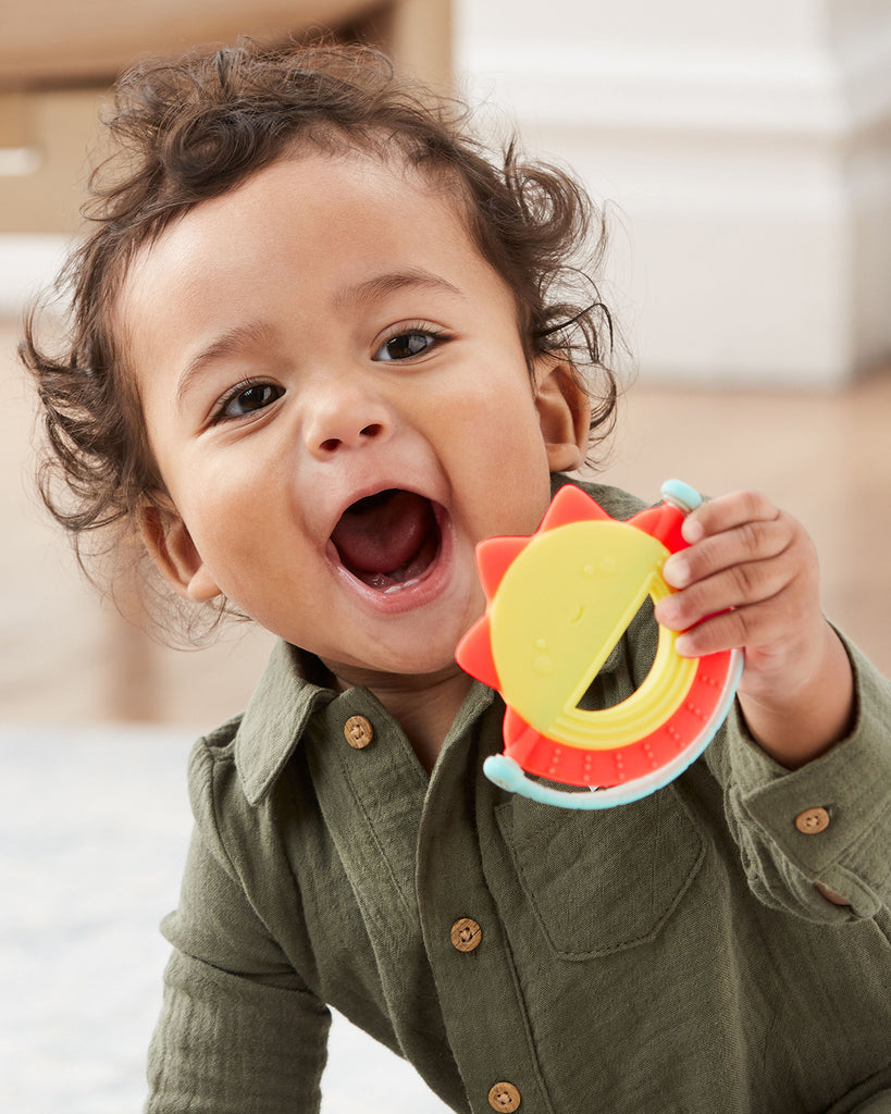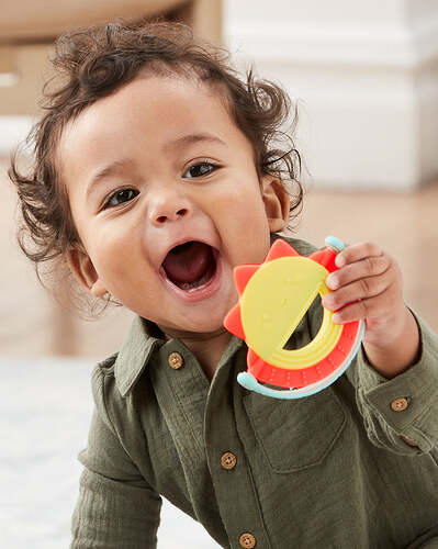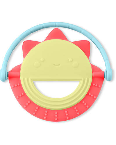 Hello, sunshine! Our adorable teether toy adds a bright spot to playtime for little teethers thanks to soft silicone material with teething-friendly textures. The easy-grab shape also features a moveable ring that’s fun for little hands to explore.