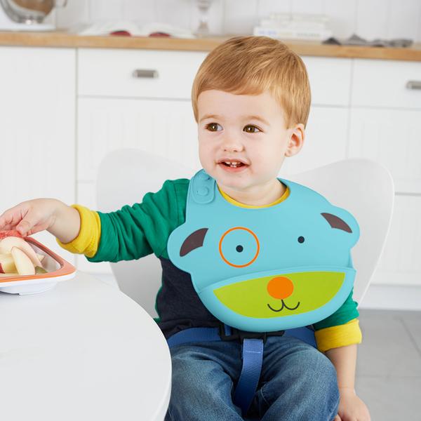 Most baby and toddler bibs get quickly stained and contribute to your laundry pile. Our Zoo Fold & Go Silicone Bib easily wipes down for quick cleanup. You can even pop it in the dishwasher! With a deep pocket to catch crumbs, it’s made of food-safe silicone and has an adjustable neck strap for baby’s comfort.