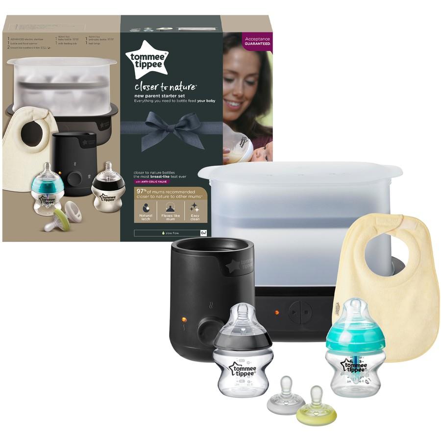New Parent Kit: 1x electric steam steriliser, 1x electric bottle & food warmer, 1x 150ml Closer to Nature baby bottle, 1x 150ml anti-colic baby bottle, 1x milk bib, 2x 0-6m breast-like soothers