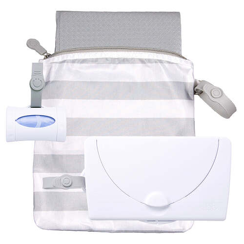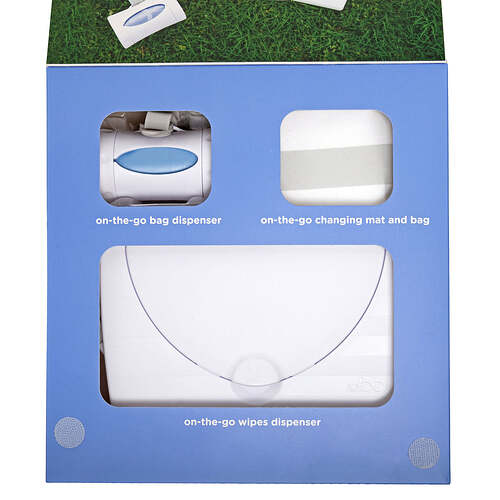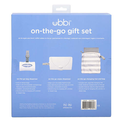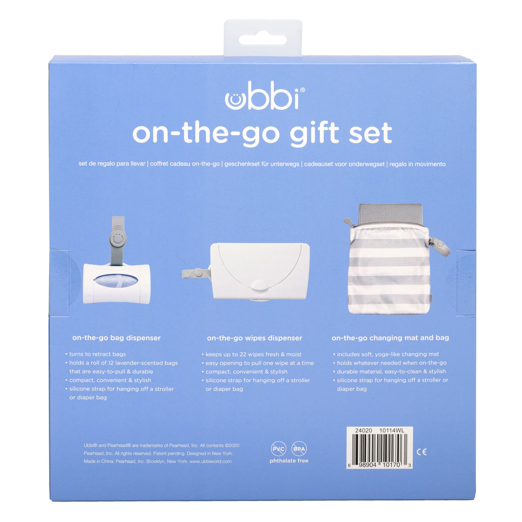 The Ubbi On The Go Gift Set contains all the on the go necessities: changing mat + bag, wipes dispenser, and bag dispenser.