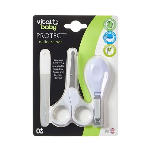 The Vital Baby 3 Piece Nail care set has everything that you need to safely care for your babies nails. Babysafe fingernail clippers, safety scissors and a nail file in one handy set.
