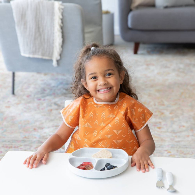 Our Short Sleeve Junior Bib is a must have for messy toddlers! With a handy crumb catcher / catch-all pocket for containing spills. Made from Bumkins lightweight, waterproof, easy-wipe, stain and odor resistant fabric. Single ply construction means no worrying about icky stuff growing between layers of fabric. Without a cotton layer, stains and smells don't stick. Wipeable and machine washable for easy cleaning so you can use it over and over again! The back hook and loop closure allows for a quick, adjustable and tug-proof fit.