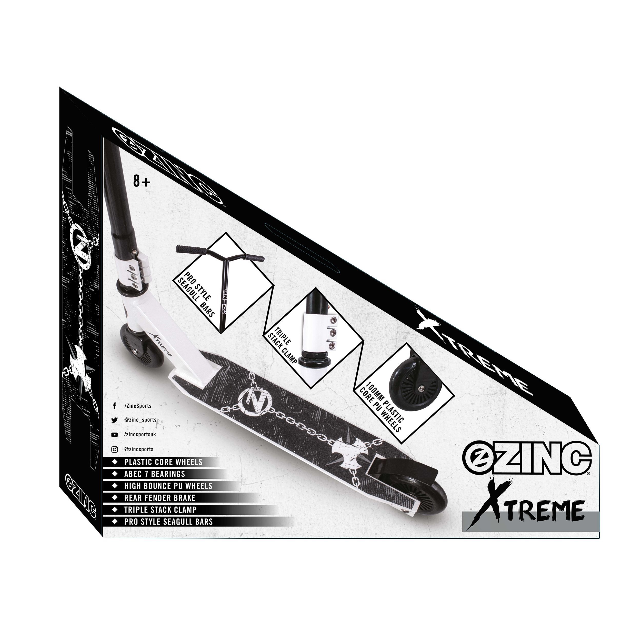 Live life on the wild side with the new Xtreme stunt scooter from Zinc! Features include seagull style handlebars, triple clamp, ABEC 7 bearings and 100mm high bounce PU wheels. With a 360 rotating non-slip deck you really will be a cut above the rest when in the air. Also comes with rubber grips to prevent any blisters.